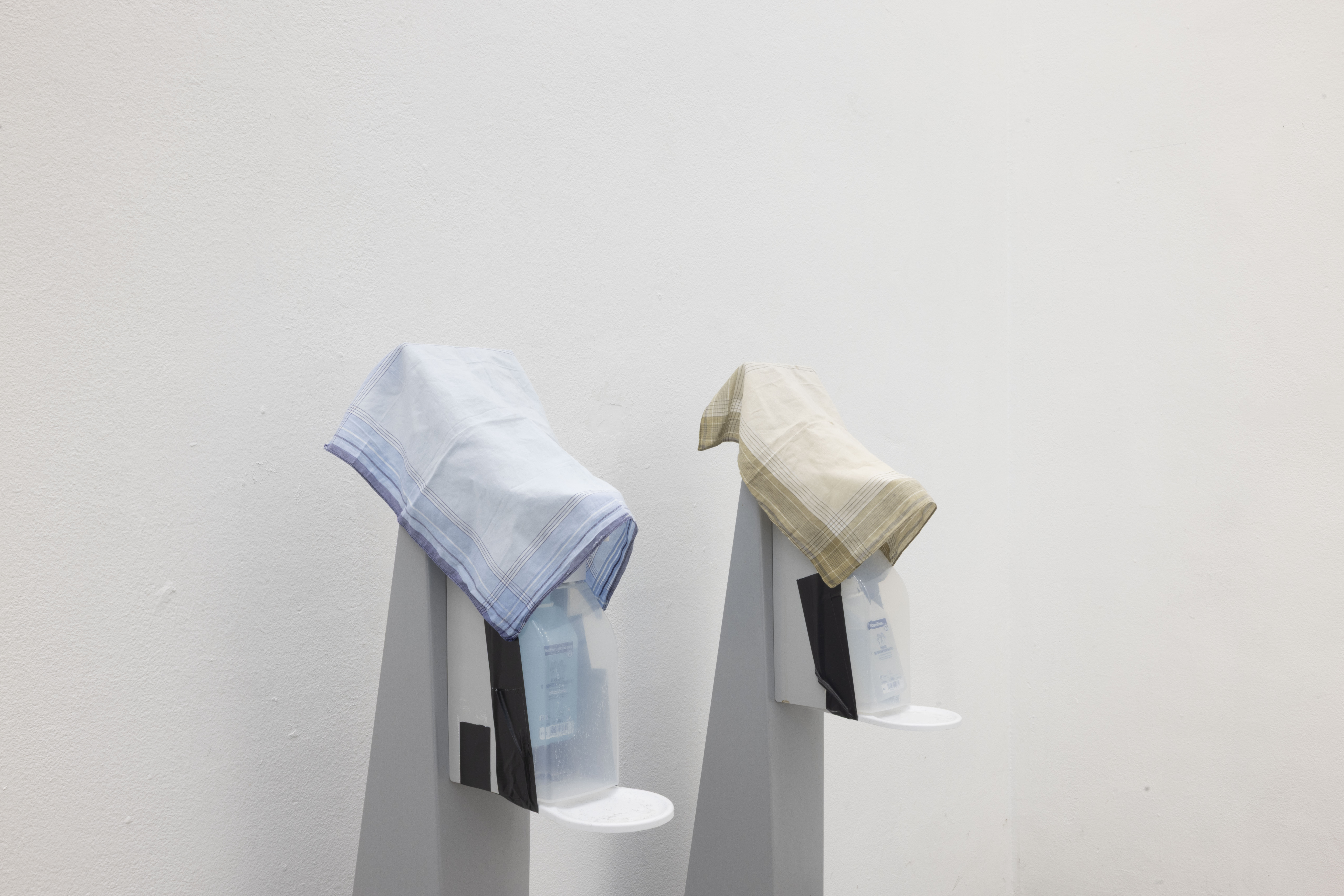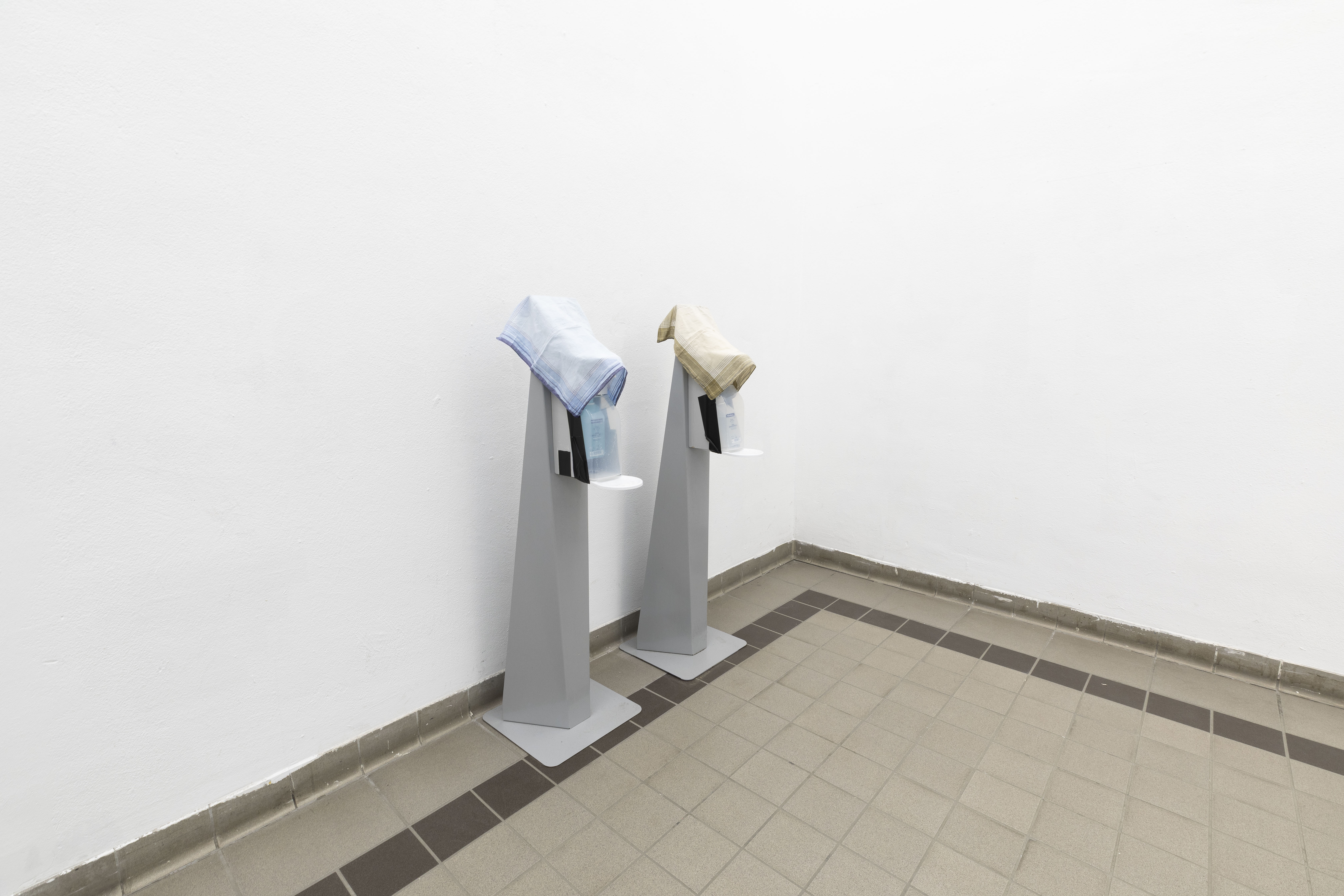 The work consists of two hand-sanitizer dispensers commonly found in public spaces. I covered them with cloth handkerchiefs, obscuring their original function. Through this simple intervention, the forms begin to resemble two upright animals, standing side by side. They appear to be waiting, yet also frozen, caught in a moment that never fully arrives. The cloth both domesticates and veils the objects, producing a ghost-like presence, as if something absent is being carefully preserved.